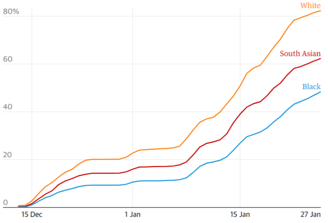Researchers monitored the vaccination status of more than 1 million people aged 80 and over from the start of the vaccination programme on 8 December and found that vaccine coverage was twice as high among white people than Black people in the first five weeks, with 42.5% of white people receiving the jab compared with 20.5% of Black people in the group. Another study from November 2020 found that participants that self-reported as Black, Asian, Chinese, Mixed or Other ethnicity were almost 3 times more likely to reject a COVID-19 vaccine for themselves and their children than White British, White Irish and White Other participants.