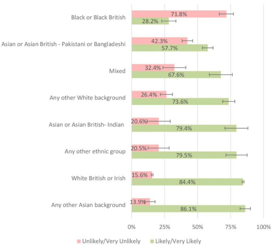 Willingness to be vaccinated in the UK Household Longitudinal Study by ethnic group (Source:Robertson et al, 2020)